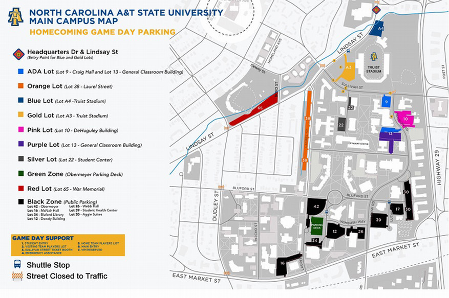 - Truist Stadium (Lot A3) - Truist Stadium Lot A4 will be closed all day on Monday, October 6, for Homecoming event.