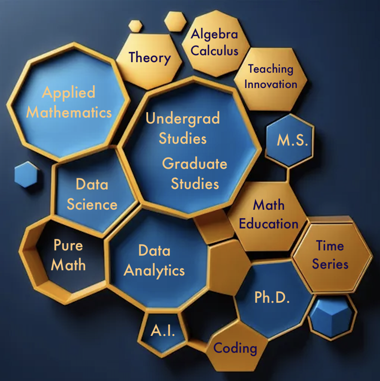 The applied mathematics concentration is designed to provide students with training in the applications of mathematics in engineering, sciences, medicine, health care, business and finance. Applied mathematics concentration is recommended for those interested in the mathematical study of general scientific concepts, principles, and phenomena that, because of their widespread occurrence and application, relate or unify various disciplines. The use of computational methods and implementation of algorithms on computers is central in the study of applied mathematics.