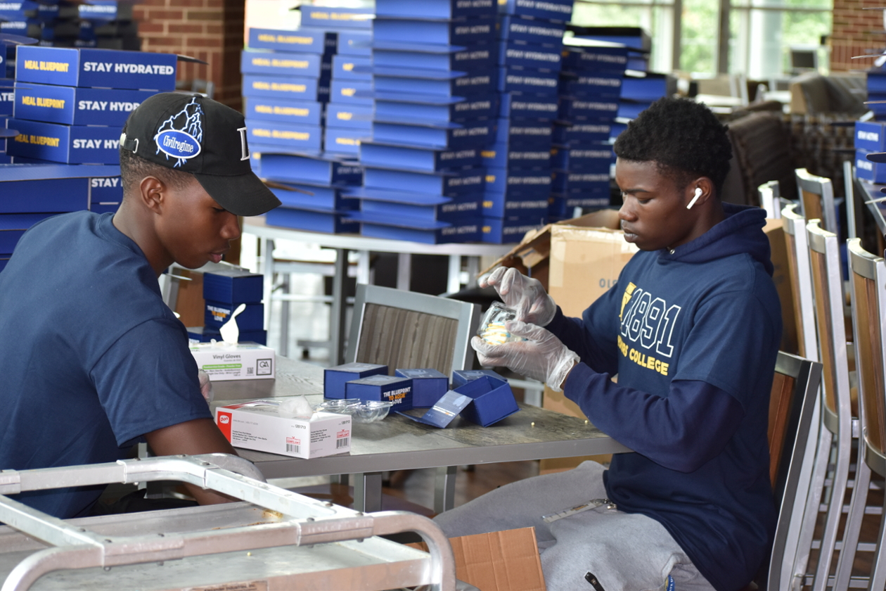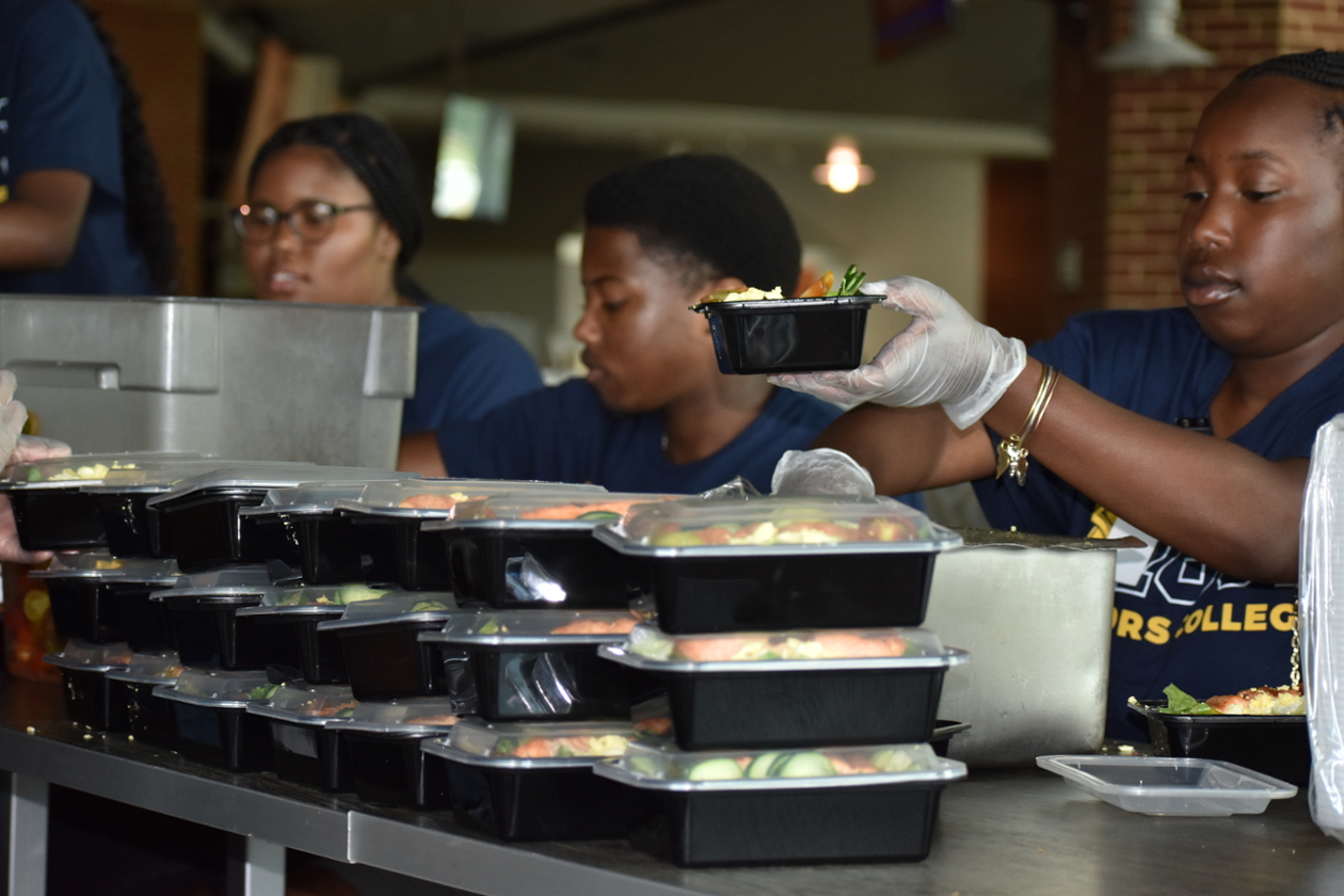 Jalia Lucas, an Honors first-year biology student from Long Island, New York, volunteered for North Carolina A&T Dining Services. Lucas, along with nine other students, gathered at Williams Dining Hall to pack food for members of the A&T campus community.